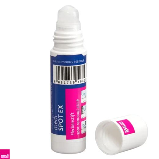 O desodorizante para meias de compressão Medi Spot Ex elimina eficazmente manchas e marcas de uso causadas por calçado ou pelo desgaste diário, sem danificar as fibras. O seu aplicador roll-on de 15 ml é inodoro e hipoalergénico, e foi concebido para vestuário e ligaduras de compressão. Graças à sua fórmula específica, limpa sem alterar a cor ou a pressão terapêutica do tecido. Ideal como tratamento pré-lavagem para meias de compressão, prolonga a sua vida útil e mantém-nas com aspeto de novas. Para um cuidado completo e profissional das suas meias de compressão, complemente a sua utilização com o detergente Medi Clean.